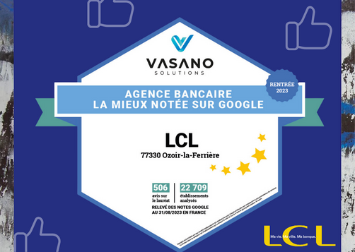 Une reconnaissance client qui permet aujourd'hui à cette agence d'obtenir le label Vasano Solutions, une distinction qui récompense les établissements bancaires français les mieux notés sur Google. En effet, parmi les 22 709 établissements bancaires français porteurs d’une fiche Google analysée par le cabinet indépendant Vasano, l’agence LCL de Ozoir-la-Ferrière a été élue en cette rentrée 2023, agence bancaire la mieux notée sur Google, avec plus de 500 avis publiés par ses clients.