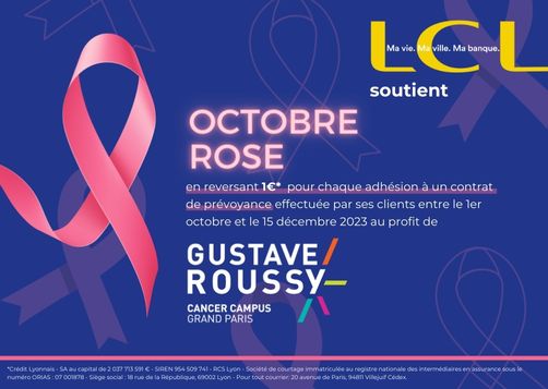 Après avoir remis un chèque de 13 000 euros à Gustave Roussy en 2022, LCL s'engage à nouveau dans la lutte contre le cancer du sein en reversant 1 euro à Gustave Roussy pour chaque adhésion à un contrat de prévoyance effectuée par ses clients entre le 1er octobre et le 15 décembre 2023. Les fonds récoltés dans le cadre de la campagne d'Octobre Rose 2023 seront affectés à la lutte contre le cancer du sein triple négatif.